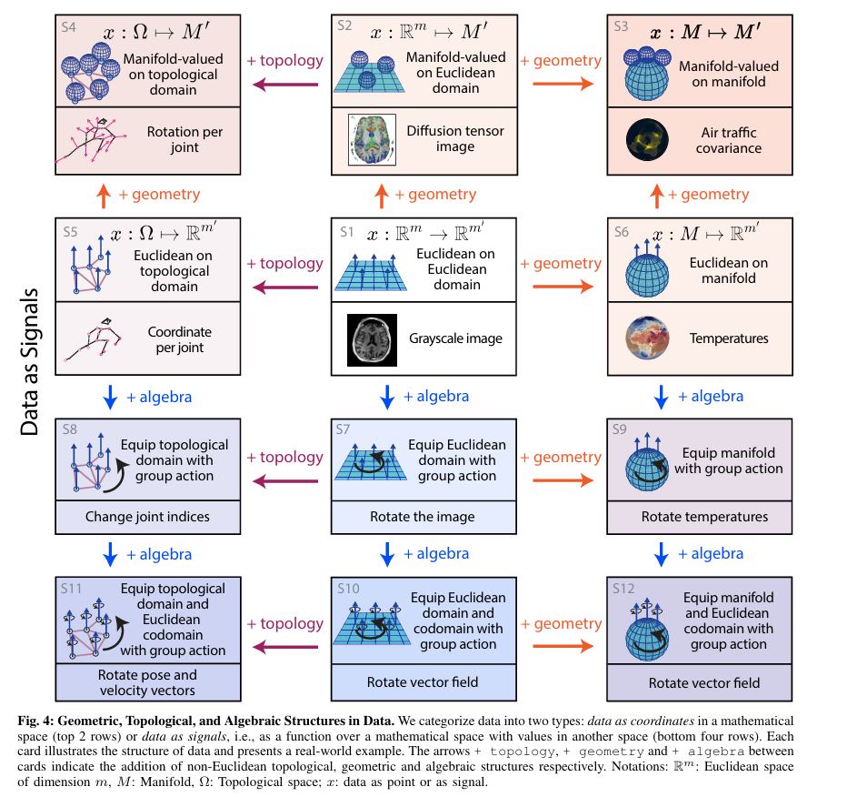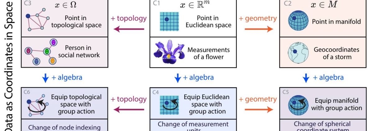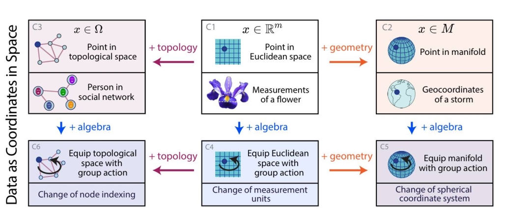 The paper talk about how “the mathematics of topology, geometry and algebra provide a conceptual framework to categorize the nature of data found in machine learning.” The two figures, present a “graphical taxonomy, to categorize the structures of data.” The article the authors discuss two types of data that we generally encounter: “either data as coordinates in space—for example the coordinate of the position of an object in a 2D space; or data as signals over a space—for example, an image is a 3D (RGB) signal defined over a 2D space. In each case, the space can either be a Euclidean space or it can be equipped with topological, geometric and algebraic structures.”