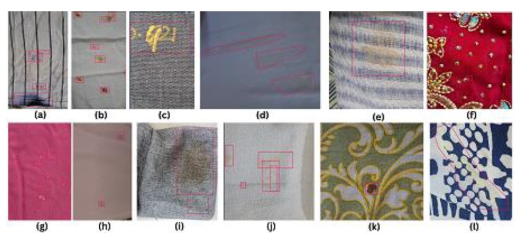 The figure below shows different spot samples with annotated bounding boxes and polygon annotation in red color 109 where (a) ink stain (b) paint spot (c) marker spot (d) makeup stain (e) rust stain (f) glue spot 110 (g)detergent stain (h) oil stain (i) coffee stain (j) food spot (k) blood spot, and (l) sweat stain.
