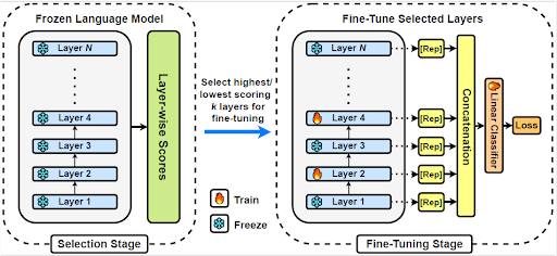 . The method identifies inter-layer relationships through a single forward pass and selectively fine-tunes layers while keeping others frozen.